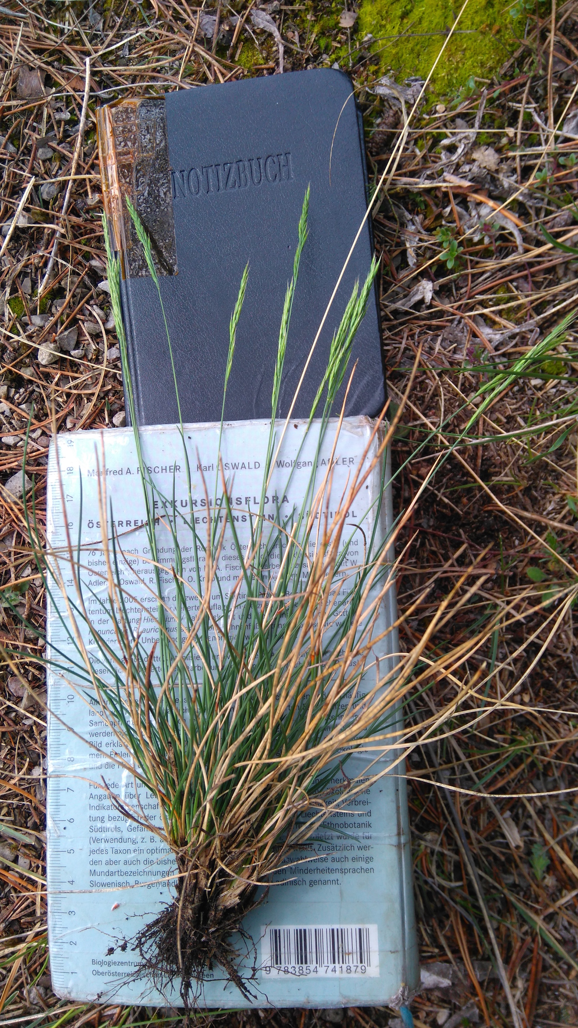 "Im Gelände und im Beitrag vom 11. 4. 2017 wurden natürlich nur die wichtigsten an den betreffenden Naturstandorten vorkommenden Festuca-Arten dargestellt und von Stefan Lefnaer (13. 4. 2017) dankenswerterweise mit Blattquerschnittsbildern ergänzt. Darüber hinaus können durchaus weitere, natürlich vorkommende, aber auch angesalbte Arten vorkommen. Unter ersteren ist Festuca stricta zu nennen, eine mit F. rupicola nahe verwandte, xeromorphe Sippe, die vor allem auf dolomitischem Felsgrus und an offenen Stellen in ganz flachgründigen Trockenrasen vorkommt und auch in ganz lichte Föhrenwälder hinein reicht. Um eine solche handelt es sich, wie sich beim Nachbestimmen herausstellte, bei der auf Fotos 7969 (download/file.php?id=370) und 7970 (download/file.php?id=371) abgebildeten Pflanze.